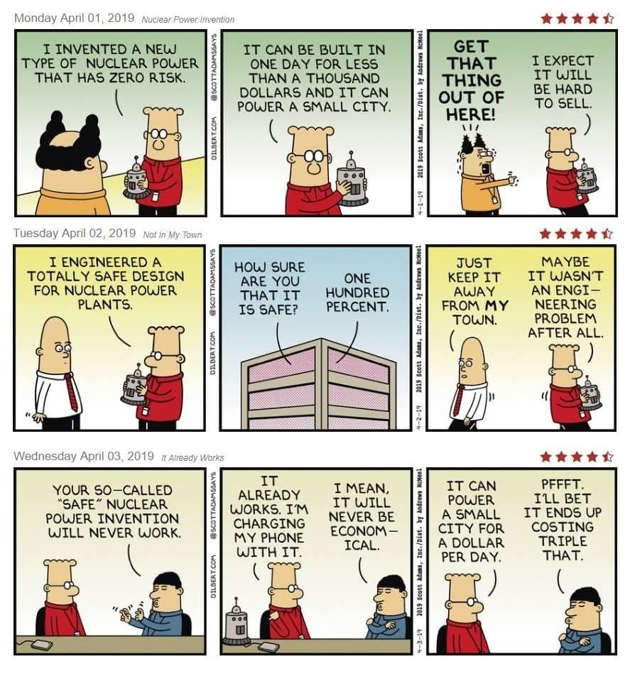 Here are a few Dilbert nuclear strips, sharp and painfully familiar.